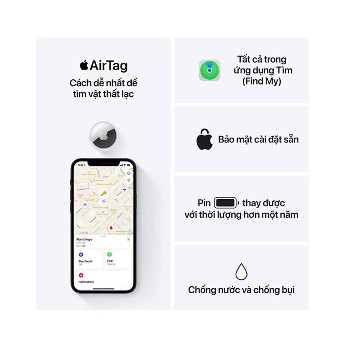 - AirTag có khả năng chống tia nước, chống nước và chống bụi. Sản phẩm đã qua kiểm nghiệm trong điều kiện phòng thí nghiệm có kiểm soát đạt mức IP67 theo tiêu chuẩn IEC 60529 (chống nước ở độ sâu tối đa 1 mét trong vòng tối đa 30 phút). Khả năng chống tia nước, chống nước và chống bụi không phải là các điều kiện vĩnh viễn, và khả năng này có thể giảm do hao mòn thông thường. Tham khảo tài liệu An Toàn và Hướng Dẫn Xử Lý để biết cách lau sạch và làm khô thiết bị.