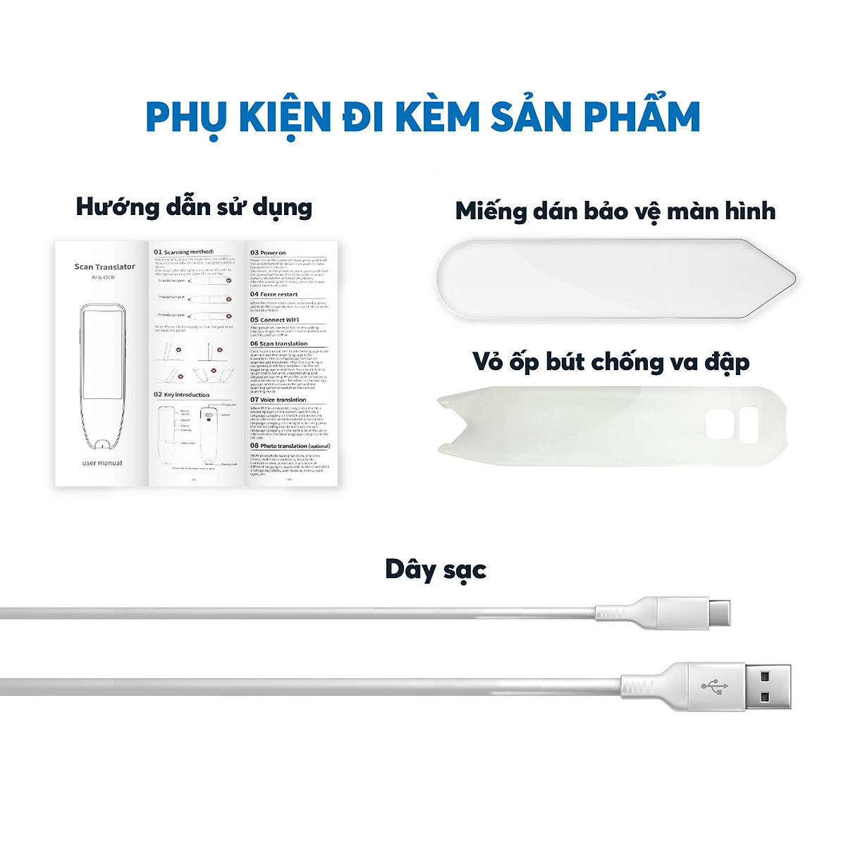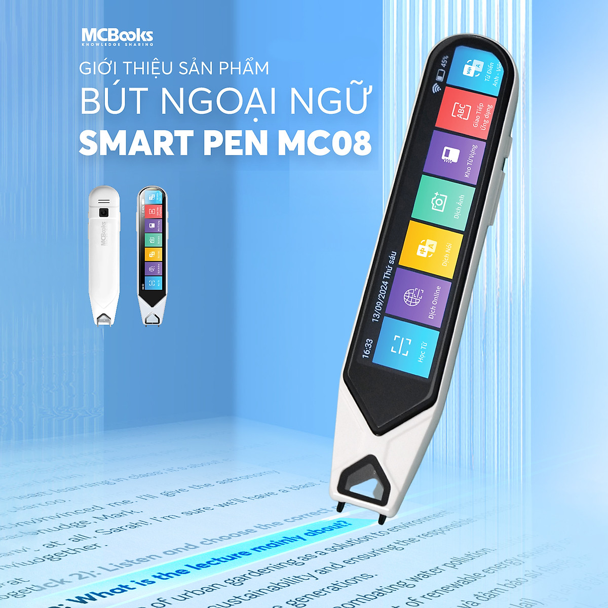Thông tin đóng gói- Bút ngoại ngữ – Smart Pen MC08- Tờ hướng dẫn sử dụng- Dây sạc chân Type-C- Miếng dán bảo vệ màn hình- Vỏ ốp bút Thiết kế bút:- Thiết kế đầu bút vát - dễ thao tác- Nú...